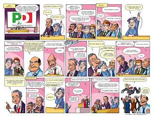 Amici, come avrete sicuramente letto su varie testate giornalistiche e su vari blog,l'avventura del Misfatto è terminata domenica scorsa. Nonostante le buone vendite, ci hanno ritenuto incapaci di fare satira e ci hanno segato in tronco per dare spazio allo staff di Stefano Disegni. Qualcuno gioirà, qualcun'altro si dispiacerà, ma tant'è. Vi dico questo: non è un addio. Ci sono nuove proposte che lo staff del Misfatto sta valutando, insomma qualcuno che ci apprezza fortunatamente c'è quindi torneremo, rinnovati e molto più agguerriti. Alle volte, quello che credevi un torto si trasforma magicamente in un favore. Per i più affezionati, non escludo una raccolta delle suddette strip in un libro... per adesso guardatevele qui man mano. Vi abbraccio!